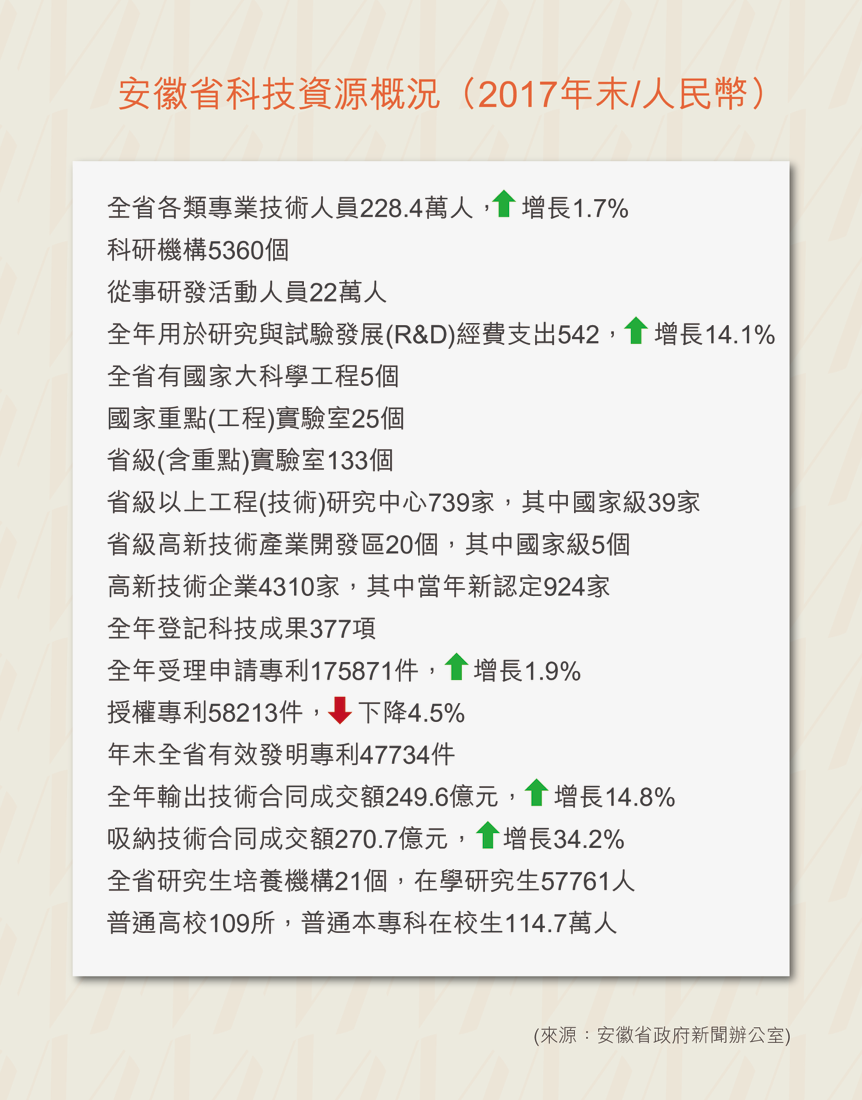 【源傳媒訊】(記者林子捷) 安徽一向給人的印像是內陸區域、農業大省,最近隨新聞聯採訪團一行,到了合肥、蕪湖、池洲等地,眼界大開,尤其創新科技的發展成績亮麗,人工智能、互聯網+、大數據、自動化、新能源汽車等等,新成果層出不窮。安徽省的科技實力厚積薄發,原創科技成果持續產出變為生產力,在迎接中美貿易戰帶來的技術創新挑戰、邁向中國製造2025的路上,安徽的⻆色會越來越吃重,顯示獨特優勢。 安徽地處地處長三角腹地,承東啓西,沿江通海。改革開放四十年,各省都在探索改革發展的路子,安徽發揮科研優勢,探索出一條體現安徽優勢的創新之路。自2012年起,安徽區域創新能力連續六年居全國一線。全省高新技術產業產值、增加值分別保持16.0%和14.8%的年增長幅度。今年來,科技創新人才不斷加速向安徽集聚,目前,在皖“兩院”院士32人,建成院士工作站209家,柔性引進院士235人,引進國家“千人計劃”人才278人、“萬人計劃”人才61人。通過實施扶持高層次科技人才團隊政策,全省累計引進近400個高層次科技人才團隊在皖創新創業,全省高新技術企業數4310家,高新技術企業已成為全省經濟轉型發展的主力軍。如今,安徽在量子通信、熱核聚變、人工智能等前沿領域,已取得了一批國際一流、國內領先的重大科技成果。