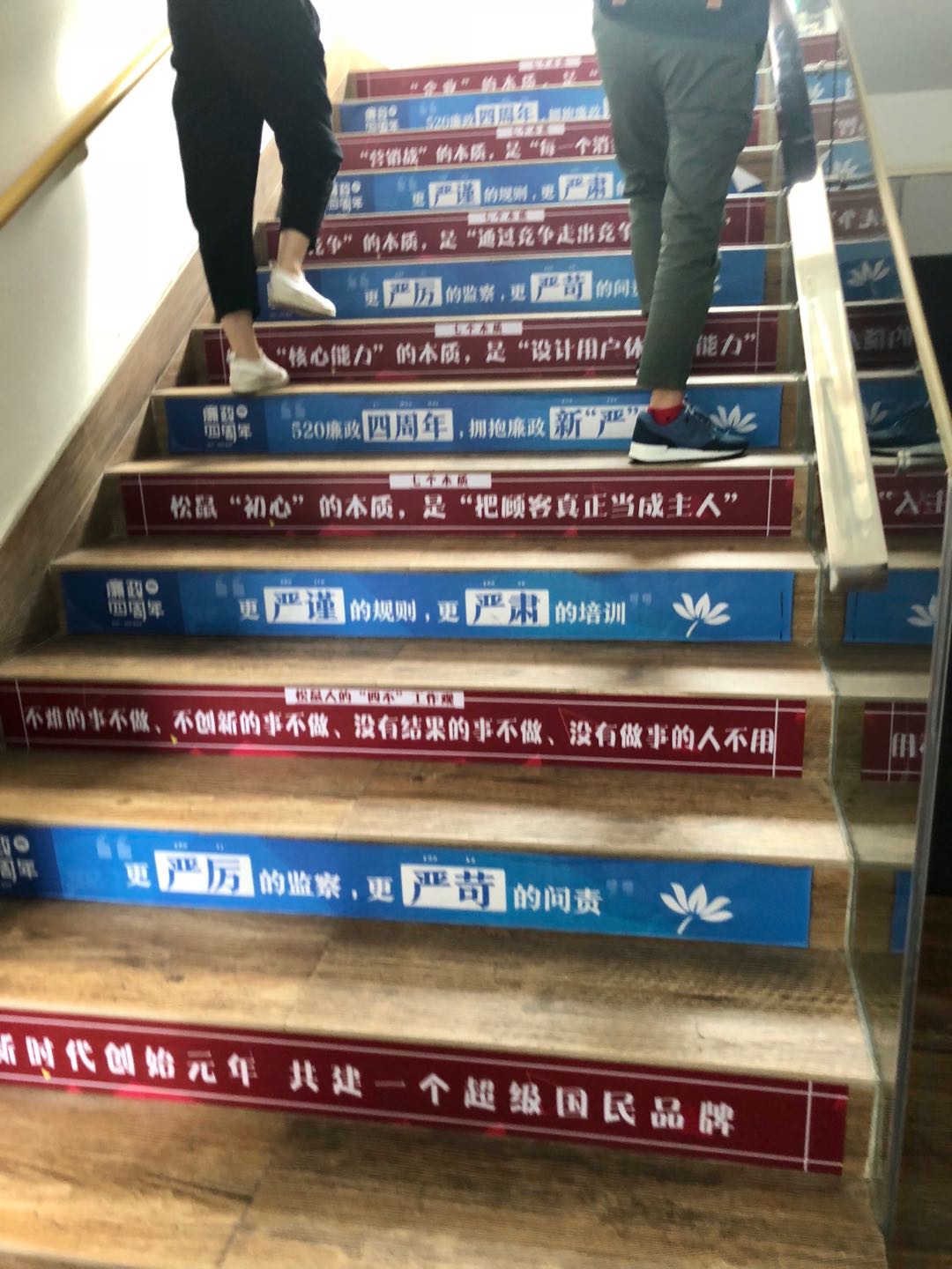 樓梯上寫滿公司理念和價值觀 在通向二樓的樓梯上,紅藍相間的樓梯寫滿了字,咋一看以為是廣告,再一看才發現是三隻松鼠核心價值。例如:“松鼠初心的本質,是把顧客當成真正的主人”、“更嚴謹的規則,更嚴肅的培訓”等等。看來,三隻松鼠上上下下都明白到文化和理念是企業的靈魂,有了它才能行穩致遠。