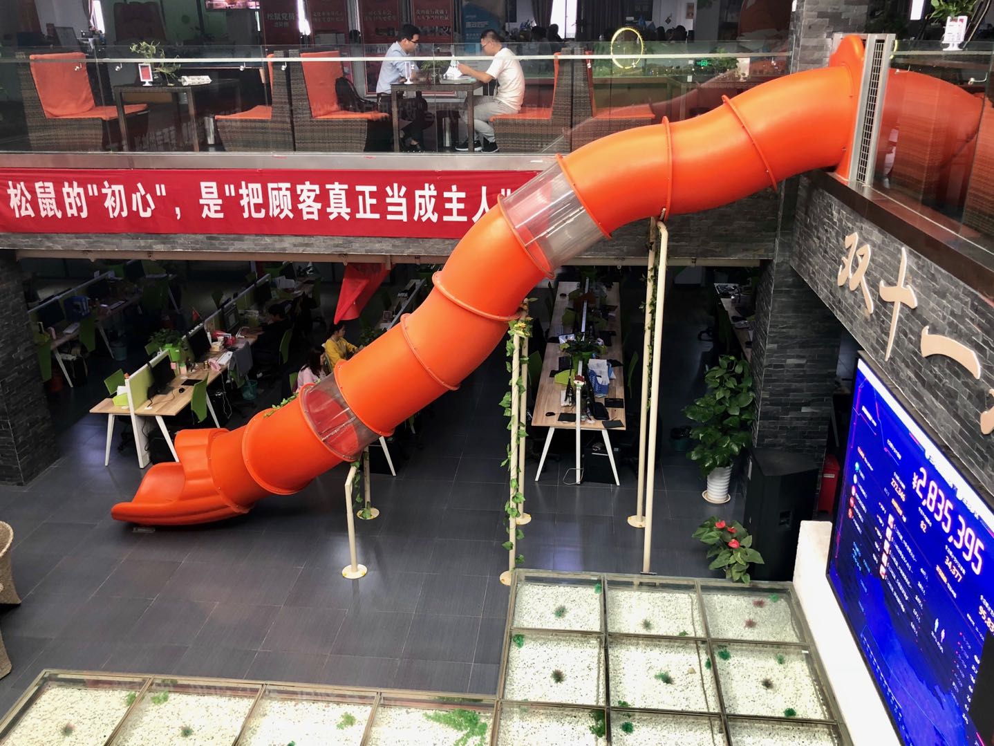 員工可以通過橙色滑梯滑下,旁邊就是“雙十一"購物節擂台 三隻松鼠自建雲中央品控平台和中創食品檢測有限公司,把農產品的生產者和消費者連接起來,通過用戶評價及檢測數據監管和促進上游生產者改善和提高品質。三隻松鼠的根本性顛覆在於,通過“互聯網+”和大數據推動了農業供給側結構性改革,在提高行業效率,降低成本的同時,提升了用戶體驗,更好地滿足消費者需求。