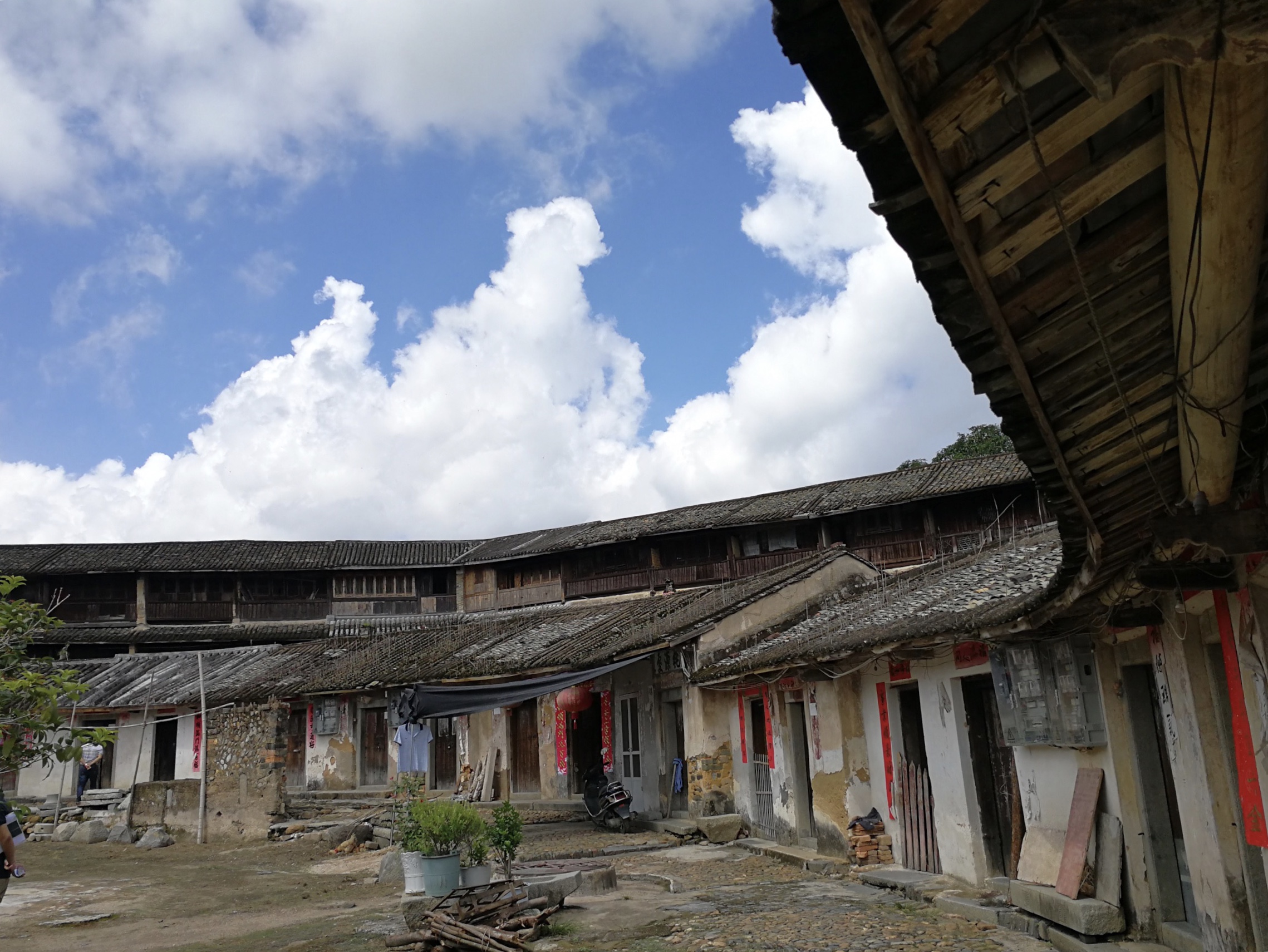 我們自行登樓參觀一進一進走進去,第一進是客廳,穿過一個天井後第二進是廚房,到了第三進是住房,一側有木梯通向樓上。二樓除了住房之外,對外的牆上顯眼地開有內大外小的洞口,那是土樓居民用於自衛向侵略者發起攻擊的地方。登上三樓俯瞰剛才走過的兩進平房的房頂,那些傾斜的線條和密密匝匝的瓦片組成的繁複圖案呈現一種古樸美感。