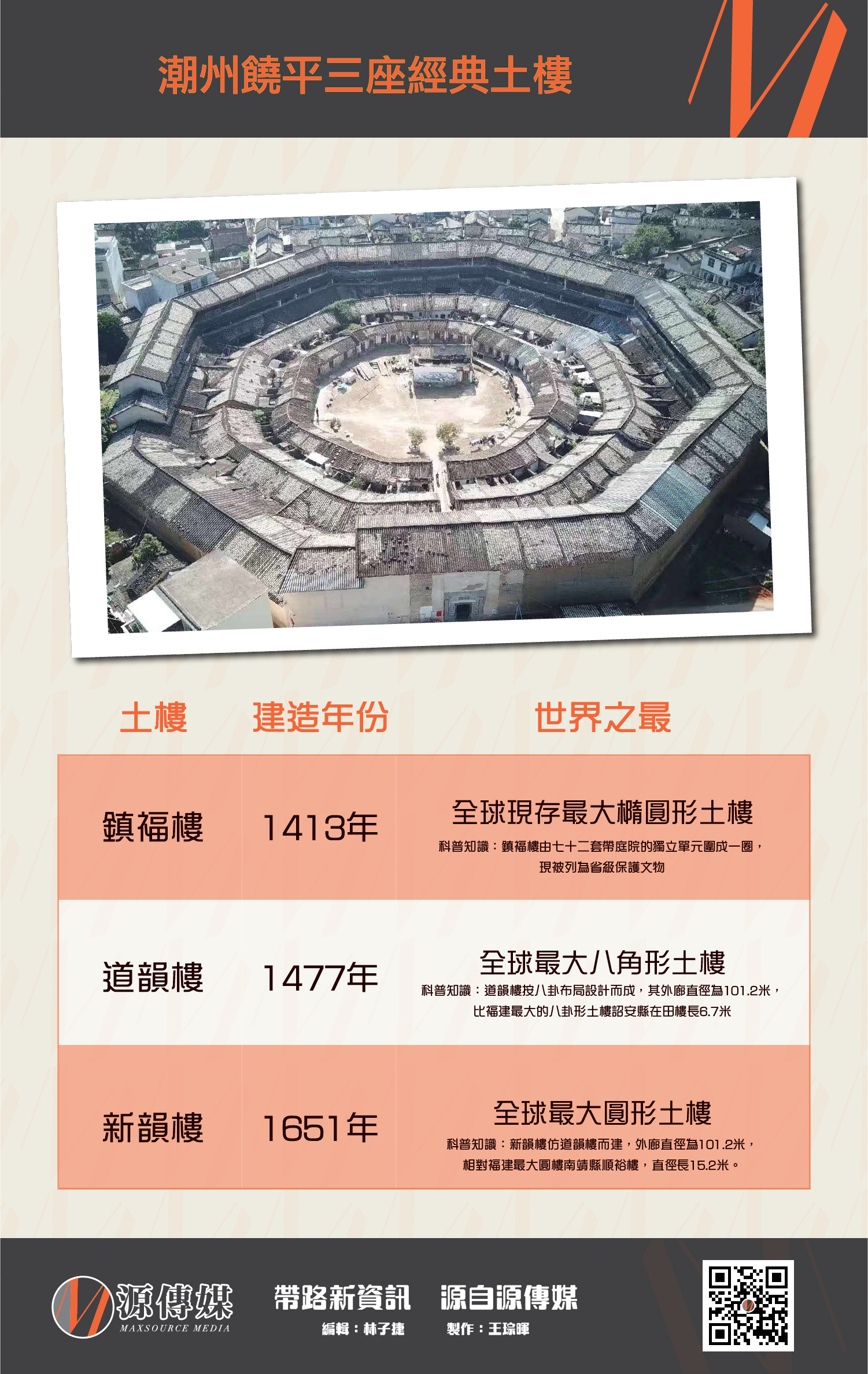 源傳媒記者:林子捷 潮州作為海上絲綢之路的重要節點和門戶,擁有豐富的海絲文化遺存。潮州土樓就是其中之一。在一般人印象中,提到「土樓」,就會想起福建被美國衛星誤認為導彈基地的永定土樓。其實,潮州的土樓不比福建的少。最為盛名的就是位於饒平的道韻樓,它不是普通的圍屋,而是一座極具獨特建築風格的八角土樓,呈現道教文化特色。據說,道韻樓是黃姓家族所有。從歷史看,潮州人的先祖多是因戰亂南遷的中原士族。未知當年攜中原農耕文化而來的客家人,如何走向海洋? 樓韻樓因年久失修,現已是破舊危樓,當局封存不對外開放,為了讓更多輿論界朋友深入瞭解內裡情況,這天,破例接待了香港記者。副縣長詹瓊英告訴我們,近年縣政府花大氣力保護道韻樓,並為其申報國家非常物質文化遺產,現在進入審批程式。