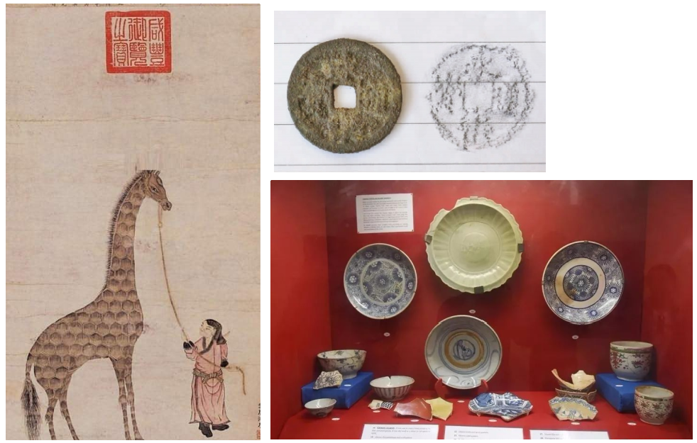 明朝時中非經貿往來:古畫《瑞應麒麟圖》(左),在肯尼亞出土的明朝瓷器(右下)及古錢(右上)