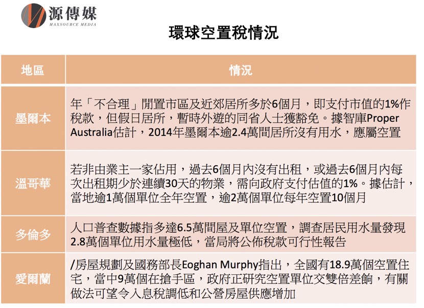 【源傳媒訊】香港特區政府於6月29日公佈六項房屋政策新措施,當中最為熱議的便是向空置一手私人住宅單位徵收應課差餉租值兩倍的所謂「空置稅」(額外差餉)。大家或許可能都有這樣的疑問,中國最高房價的城市香港,即將徵收空置稅,內地城市有可能效法嗎?源傳媒記者 林蓁芯 所謂房屋空置稅,是世界各地政府為了充分利用資源而對空置的居民房屋收取一定量的稅收,各處規定不盡相同,不過,一般都是對二手房徵收空置稅。例如加拿大溫哥華當局規定,房屋每年空置達到6個月便需要按照房產價值的1%來交稅,謊報業主將面臨每天罰款1萬加元的嚴厲處罰。 不少人都很好奇:感覺內地住房空置率更高,內地會像香港一樣徵稅嗎?要研究這個問題,首先要先看看內地住宅空置率有多高。 內地空置率成迷 令人不解的是,一直都沒有一個機構提出準確的數據,住宅空置率在內地像是謎一樣的存在。騰訊房產研究院2015年曾指內地主要城市的住房空置率整體水準在22%至26%之間。 原中財辦副主任楊偉民在2018陸家嘴論壇上提到,在中央財辦時曾經請有關單位,通過用電量來對全國住宅空置情況摸底調查,結果顯示內地無論是城鎮還是鄉村住宅的空置率都相當高,推算比日本這種高度城市化、老齡化、少子化的地方還要高,而日本的空置率是13%。不過,楊偉民沒有提出實際數據,但可以合理推論內地空置率一定高於13%。這個數據不僅高於曾經發生樓市崩盤的日本,更高過美國、歐盟等地區。