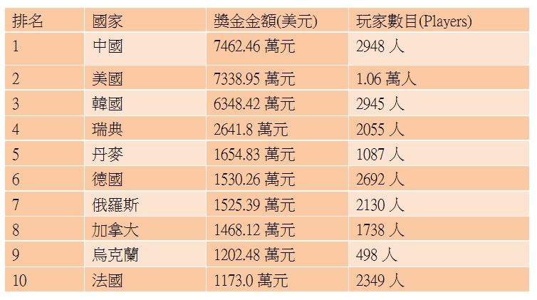 香港電競總會主席周啟康指出,韓國電競業發展迅速,主要因政府在電競業下了很多功夫。 正所謂「台上一分鐘,台下十年功」,電競選手勝利背後所下的功夫又有多少人知道?被譽為世界第一的Faker,除了放假、旅遊,其他時間基本都在訓練,敬業到連戀愛都不談。Faker在SKT1的訓練一般從中午開始,直到晚上11點結束,其中包括3個小時吃飯、休息和基本力量訓練。在結束個人訓練之後,通常會加訓到淩晨4點才結束。 中國電競業「超韓趕美」 中國電競發展緊隨韓國之後,更有「超韓趕美」之勢。根據電競數據統計網站E-Sports Earnings的數據,截至6月27日,電競獎金排行榜中,獲得最多獎金的是中國,獎金金額達約7462.46萬美元,玩家(Player)數目2948人;美國排第二,獎金金額達約7338.95萬元,玩家數目1.06萬人;韓國排第三,獎金金額達約6348.42萬美元,玩家數目2945人,可見中國電競選手吸金能力最強。 E-Sports Earnings電競獎金排行榜按照國家/地區劃分